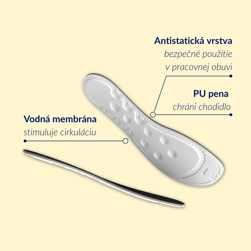 Každý detail vložky MEDICOVI A40 je navrhnutý tak, aby odľahčil vaše nohy počas dlhej pracovnej zmeny. Vodná membrána rozkladá tlak v pätovej aj prednej časti chodidla a chráni kĺby pred preťažením. Mäkká penová vrstva s antistatickou úpravou dodáva príjemný pocit pri každom kroku a zaručuje bezpečnosť aj v náročnom pracovnom prostredí.